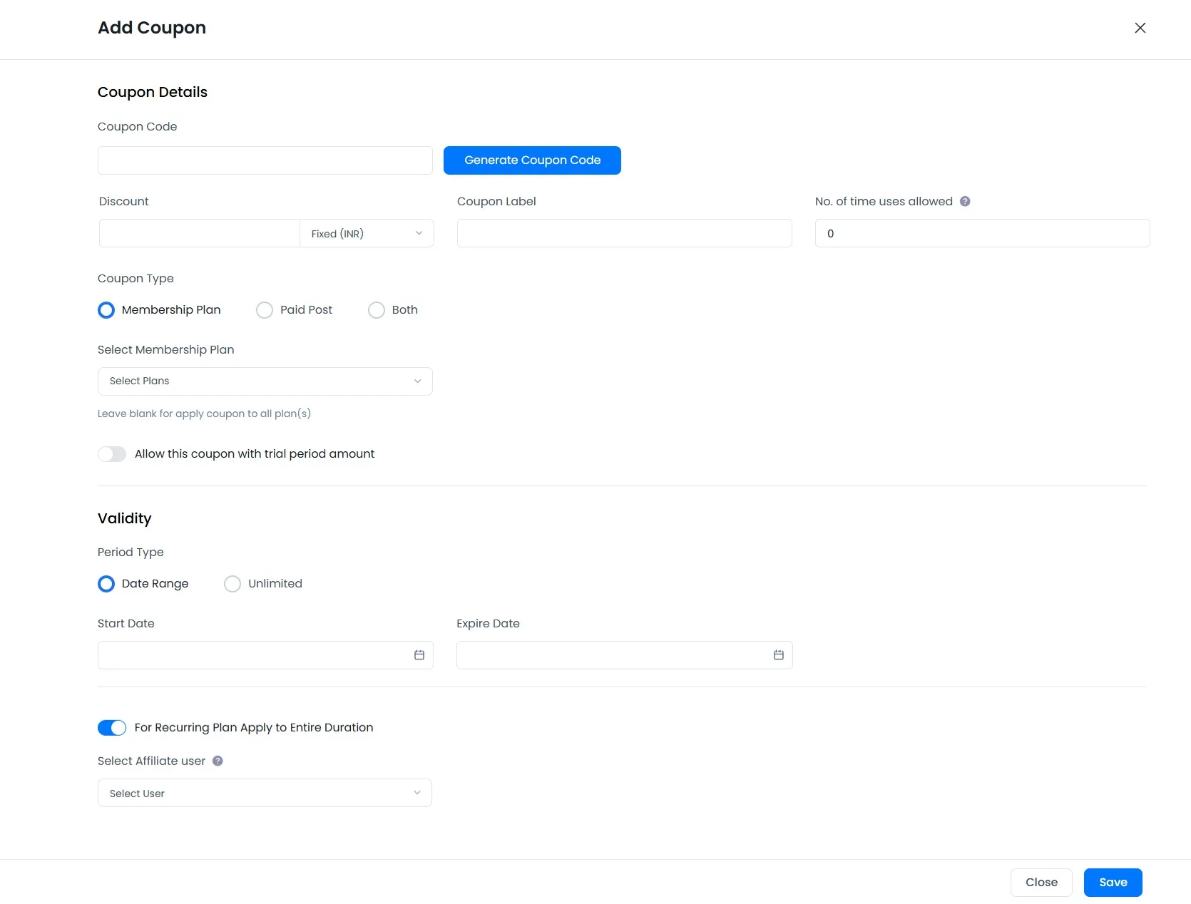 Allow to give referral to affiliates on purchase membership plan with coupon code.