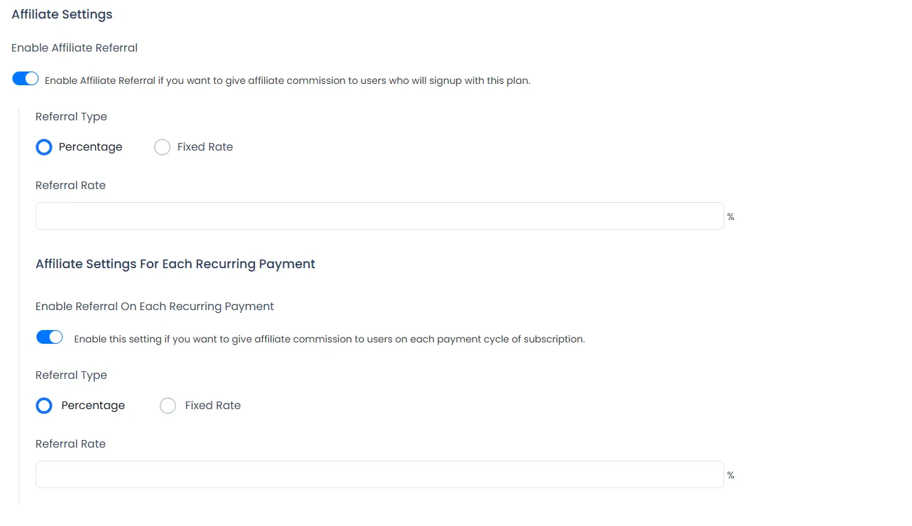 You can set referral rate in ‘Fixed Rate’ or ‘Percentage’ wise.
