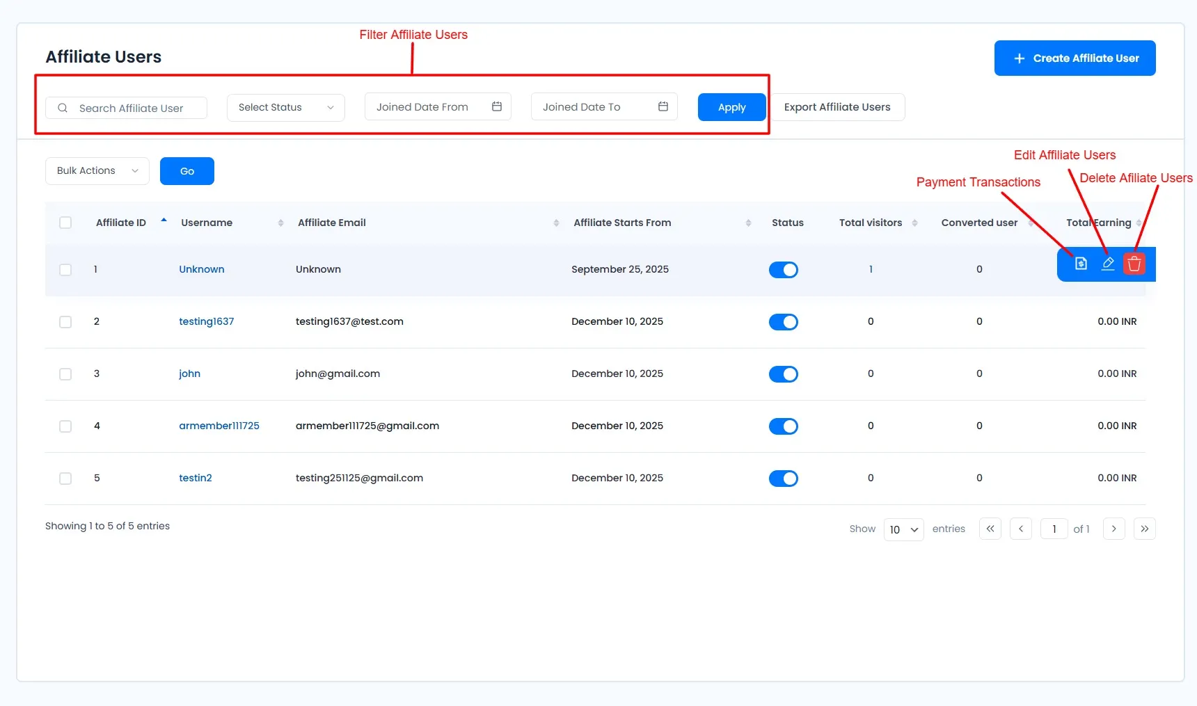 Here you are able to see all affiliate users listed with individual details like affiliate id, Username, Email