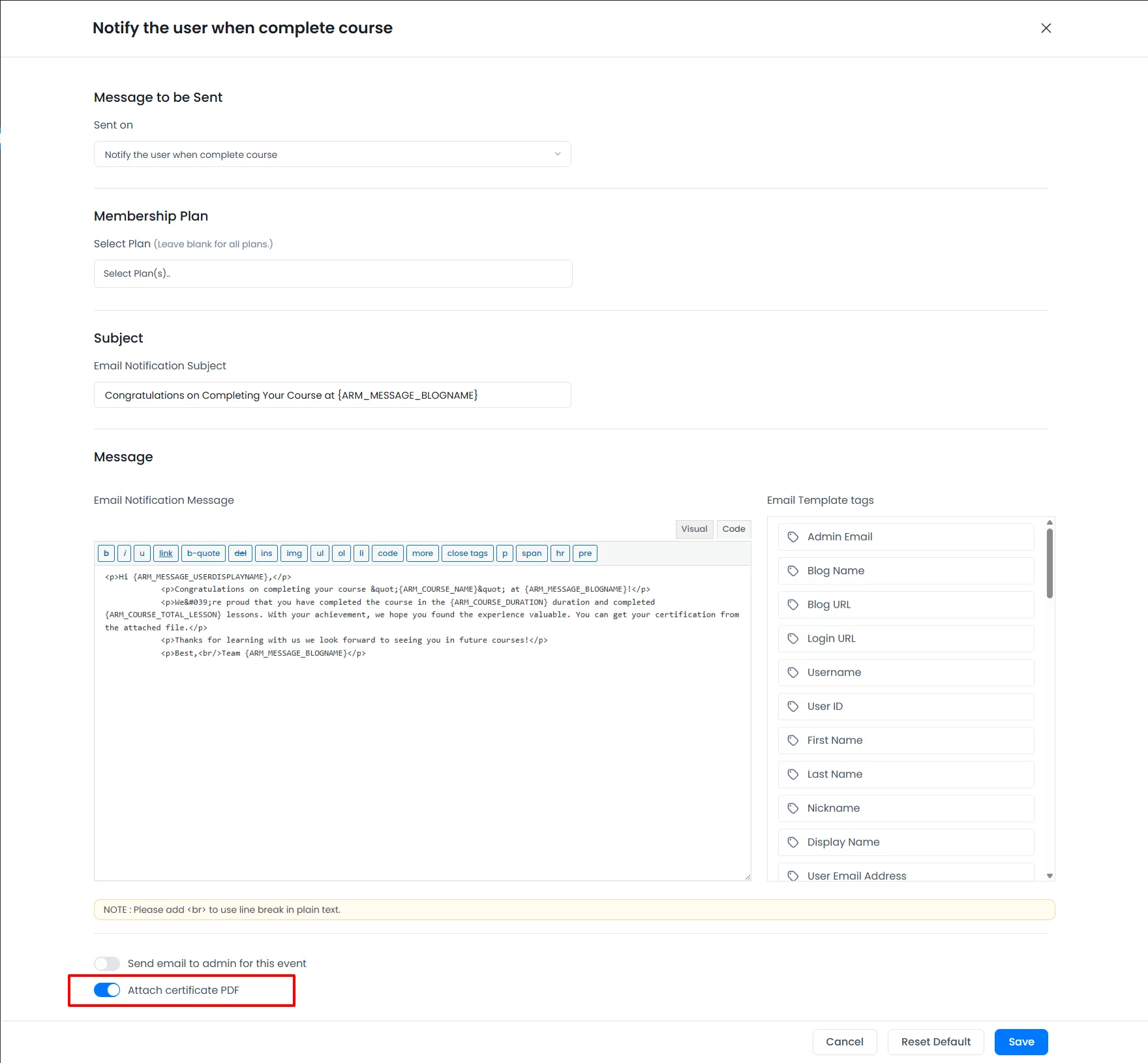 ARMember does provide a facility to attach the Certificate PDF to the email notification Notify the user when complete course. So if you are willing to send the email notification to the members when they complete the course then you can configure this email notification along with the certificate attachment then you can enable the switch below at the “Attach certificate PDF”.