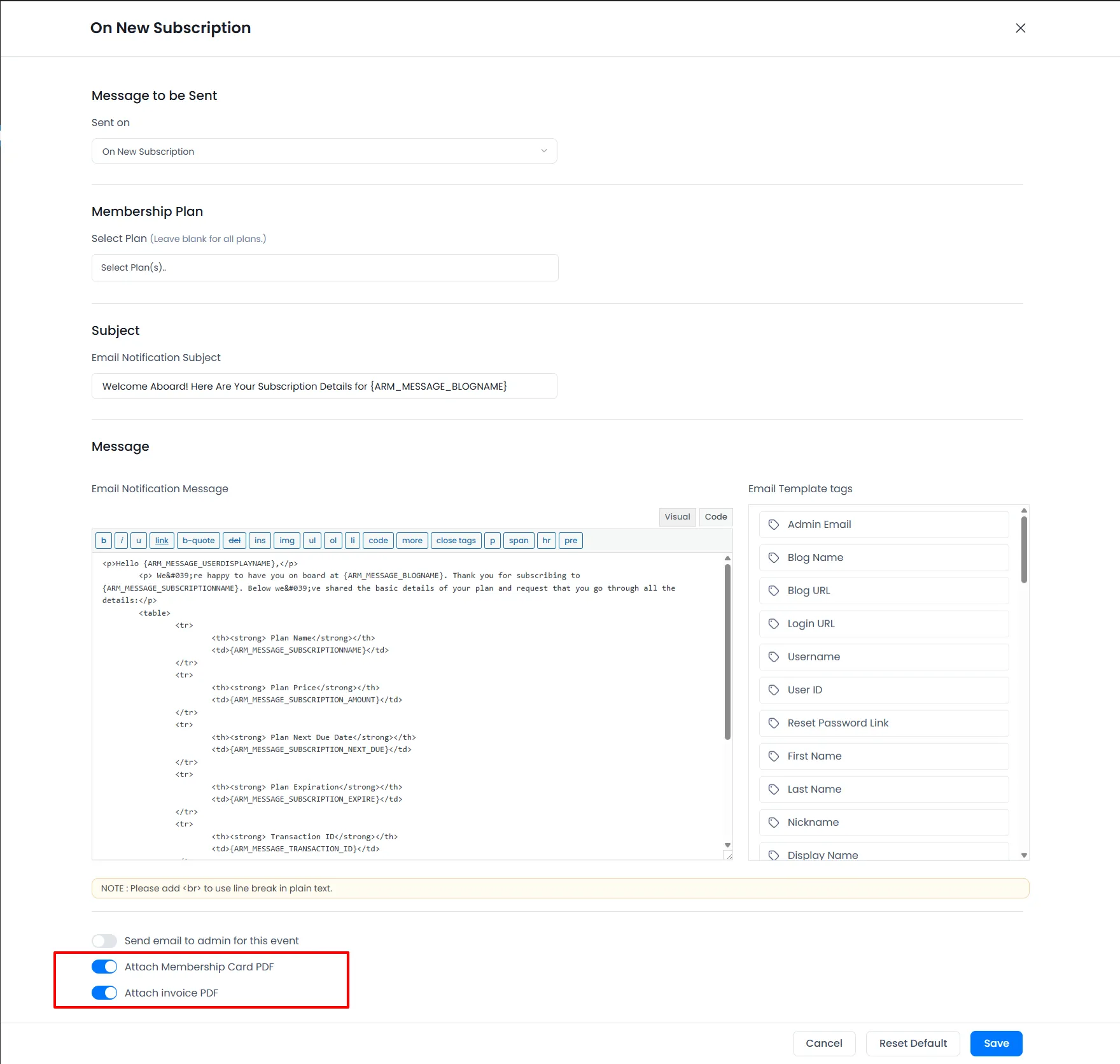 ARMember->Add-onsPage. - Here is a list of Email Notification allowed “Attach Membership Card PDF” or “Attach invoice PDF” Attachment option.