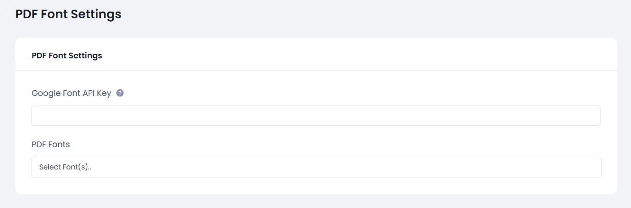 Above screen in “Google Font API Key” and “PDF Fonts” two option field view. “Google Font API Key” for the Google font use in PDF document and “PDF Fonts” in default and google font selection for PDF document.