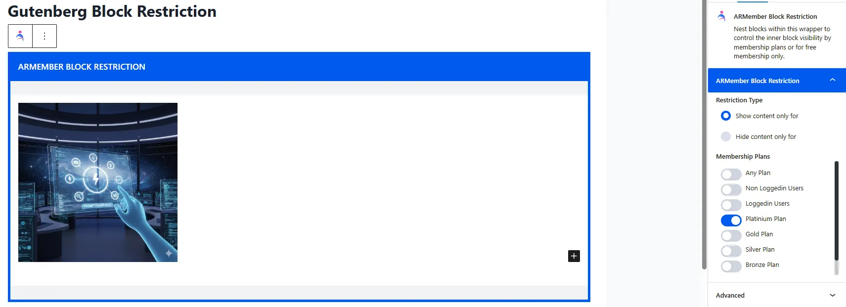 After activated Addon you can restrict Gutenberg blocks as show/hide for Membership Plans/Non-logged-in User/Logged-in user.