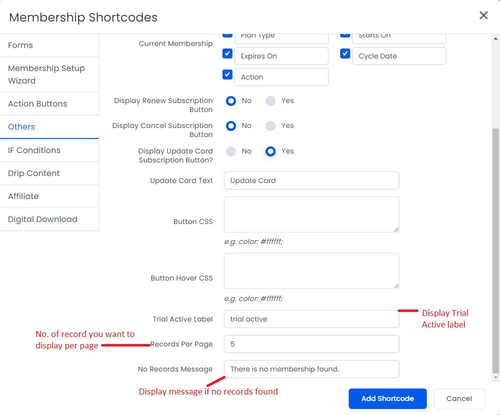 - On the other hand, you may also configure the Trial Active Label, the number of records to show per page, and a custom message for when no membership data is found.