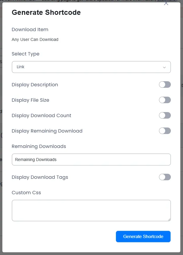 Generate ShortcodeButton, by clicking on it you will get popup in which you can addDisplay Description,Display File Size,Display Download Count,Link Type&CSSparameter that you want to require. -
