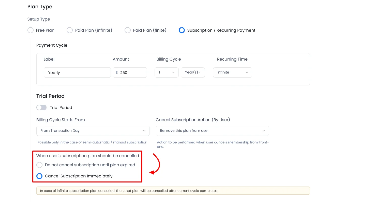 Also there are two more option provided at the time of setting the plan that whether the subscription should be cancelled immediately or after the plan gets expired.