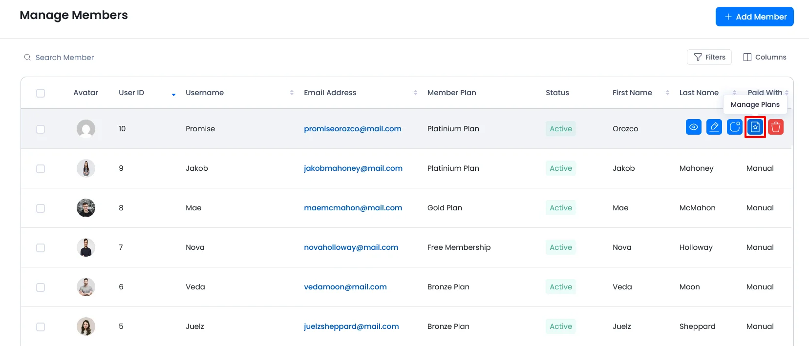 On this page, hover on any member and here at the action button you will be able to check the Manage Plans icon, click on it and a popup will appear.