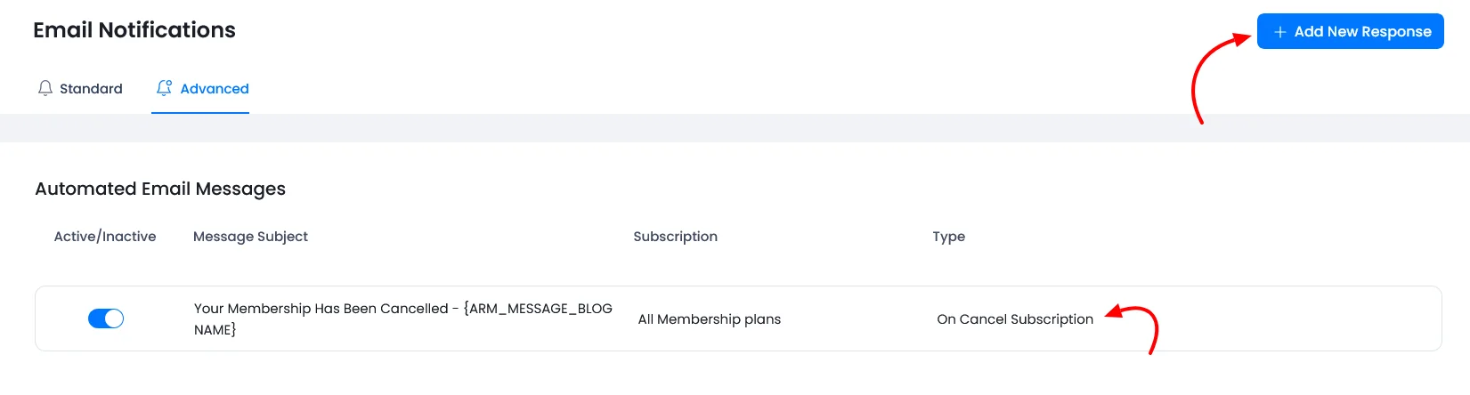 ARMember does provide a facility to send email notifications when a member cancels their membership. This email can be sent out to both, the members and the admin as well. In order to set this mail, one can navigate to the ARMember ⇾ Email Notifications ⇾ Add New Response. Furthermore, at the popup dropdown, select the mail title as On Cancel Subscription and add the mail content as per your requirements.