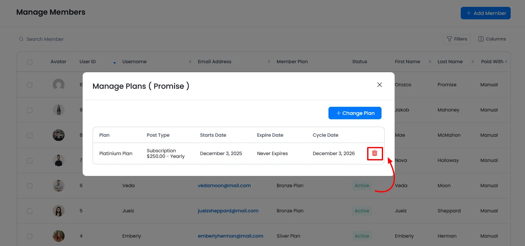 At the popup, you’ll be able to check Delete icon. By hitting this icon, the admin can remove or cancel the member’s plan.