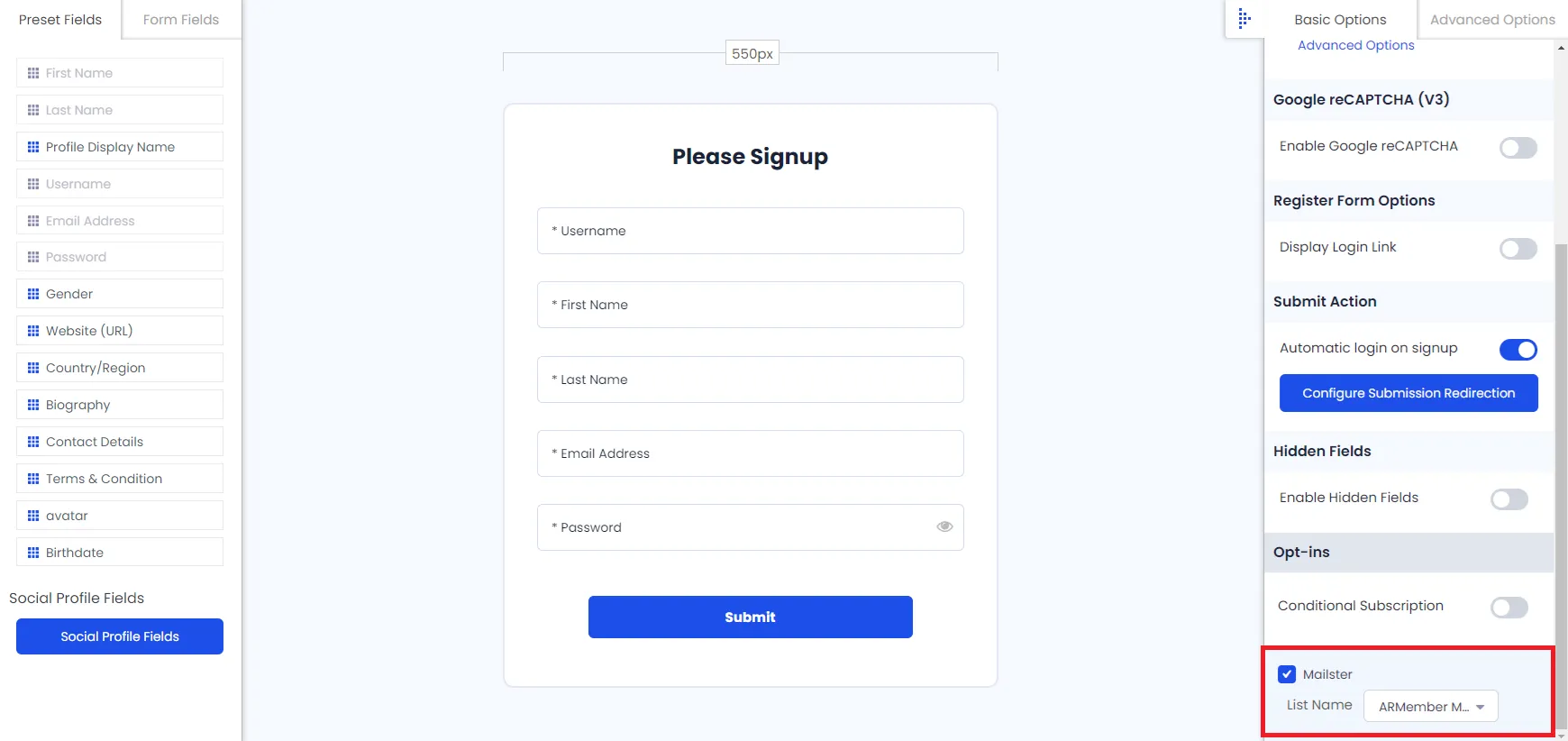 ARMember⇾Manage Forms. Edit your sign-up form. In the right panel, you will see the Opt-ins section. You will see a list of all configured opt-ins with a checkbox. Select checkbox for Mailster and select List in which you wish to add all users who will register through this sign-up form, in your Mailster mail list. -