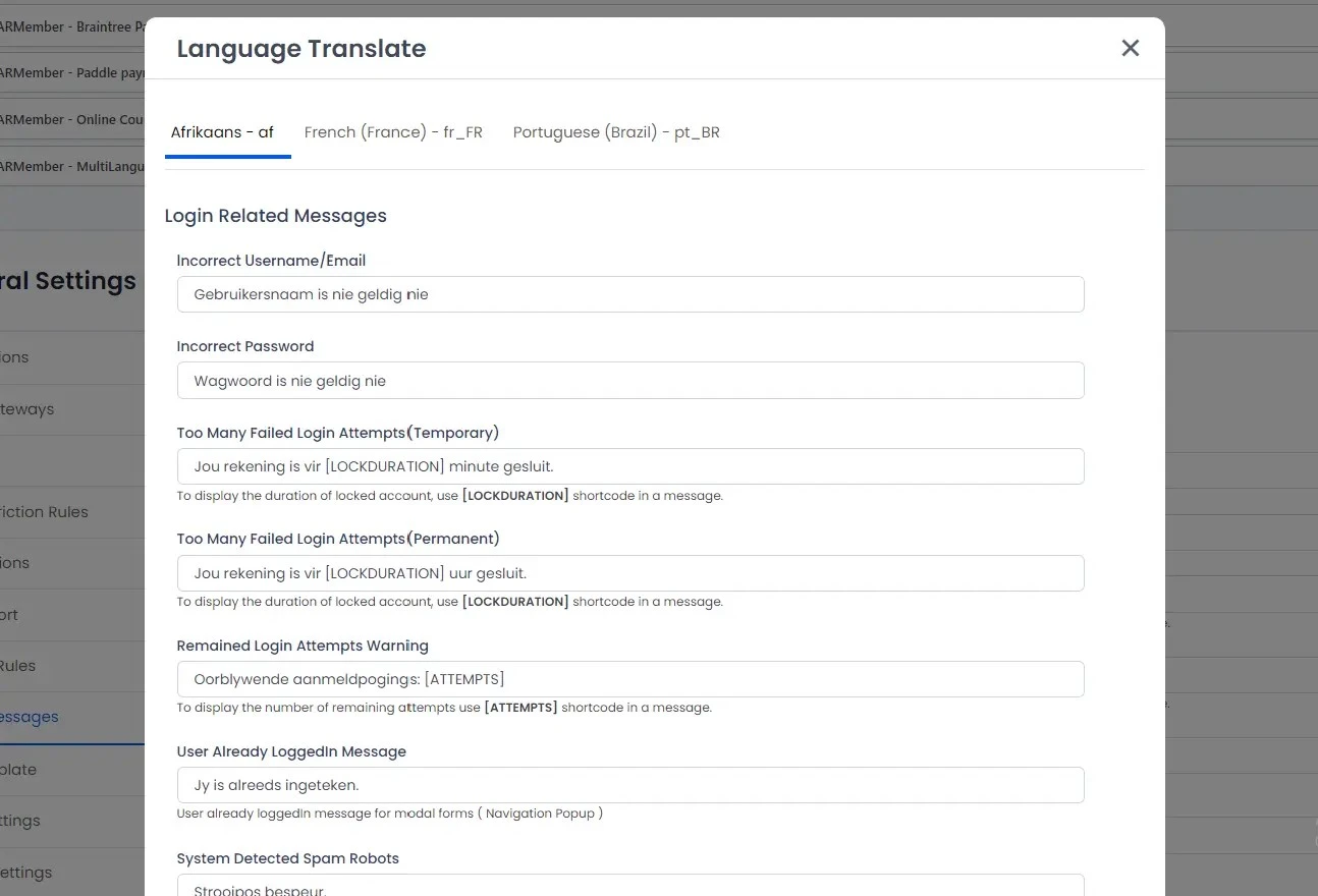 ARMember->General Settings->Security Options. Here, click on the Translate button from the top right corner of the page, and you will be able to see a popup of Translation options on the center of the screen. - Now, select the Language and configure all the security options in multiple languages as per your requirement and these messages will be displayed as per the languages of the website.