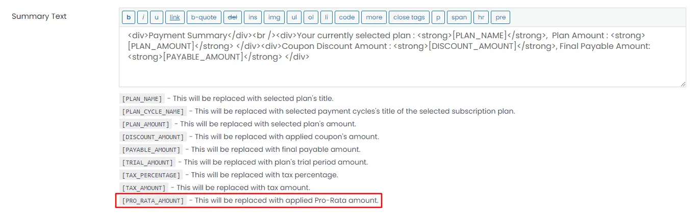 ARMember does provide a facility to add the pro-ration shortcode at the “Payment Summary.” In order to add this shortcode, you can navigate to the ARMember ⇾ Configure Plan + Signup Page, and here you can add the shortcode [PRO_RATA_AMOUNT].