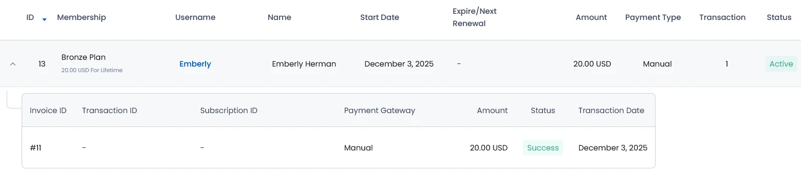 ARMember also provides a section for Manage Subscriptions. Here you can easily search the member and then accordingly check all the transactions made by the members for different plans. The following image shows the fields that are displayed at the