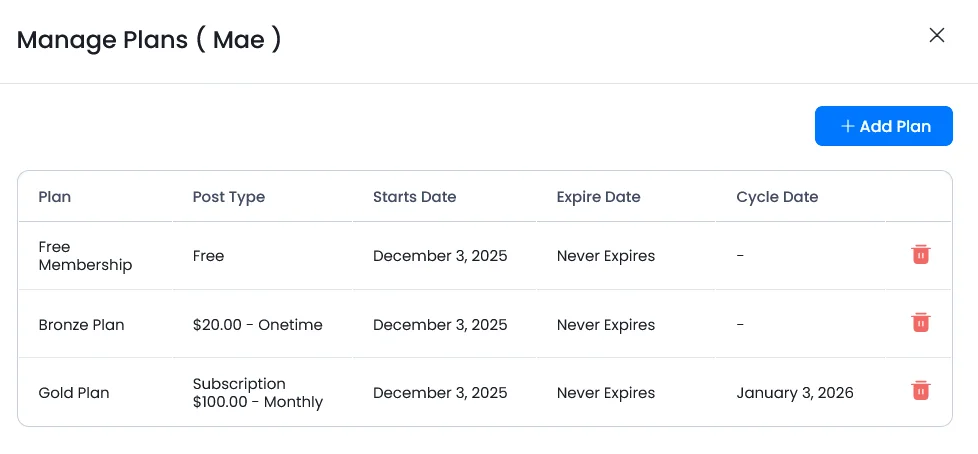 When a member already has one plan and purchases a new one, then the previous plan will not be removed from the member’s account. So, it will be considered as Add Plan action and new plan is added in user’s plan list. Users can have as many plans as they want simultaneously. Thus, there is no limit to the purchases of the plans. This eventually allows the site owner to generate an ample amount of revenue.