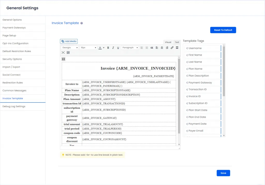 Once you activate the addon, you will find a pre-built invoice template by navigating ARMember > General Settings > Invoice Template. The addon has been designed in a way that the person with less technical knowledge can also customize the template in just a few clicks.